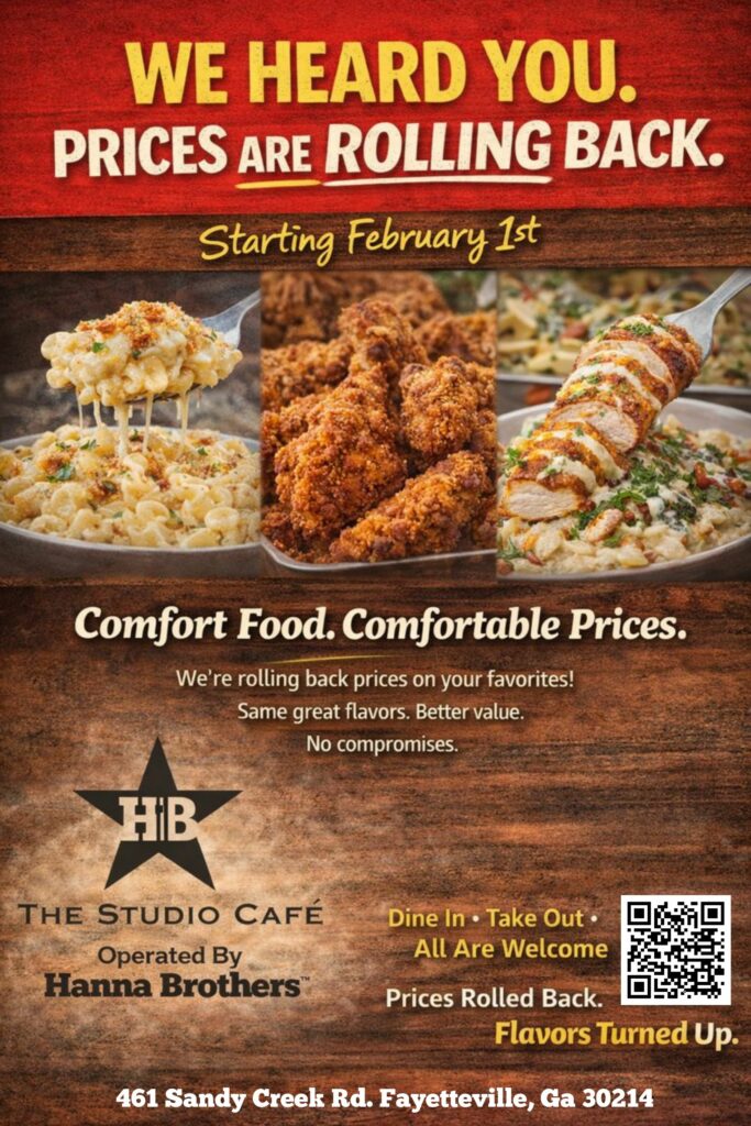 At The Studio Café, we believe comfort food should be comfortably priced. That’s why we’re rolling back prices on your favorite dishes; not as a sale, but as a statement.